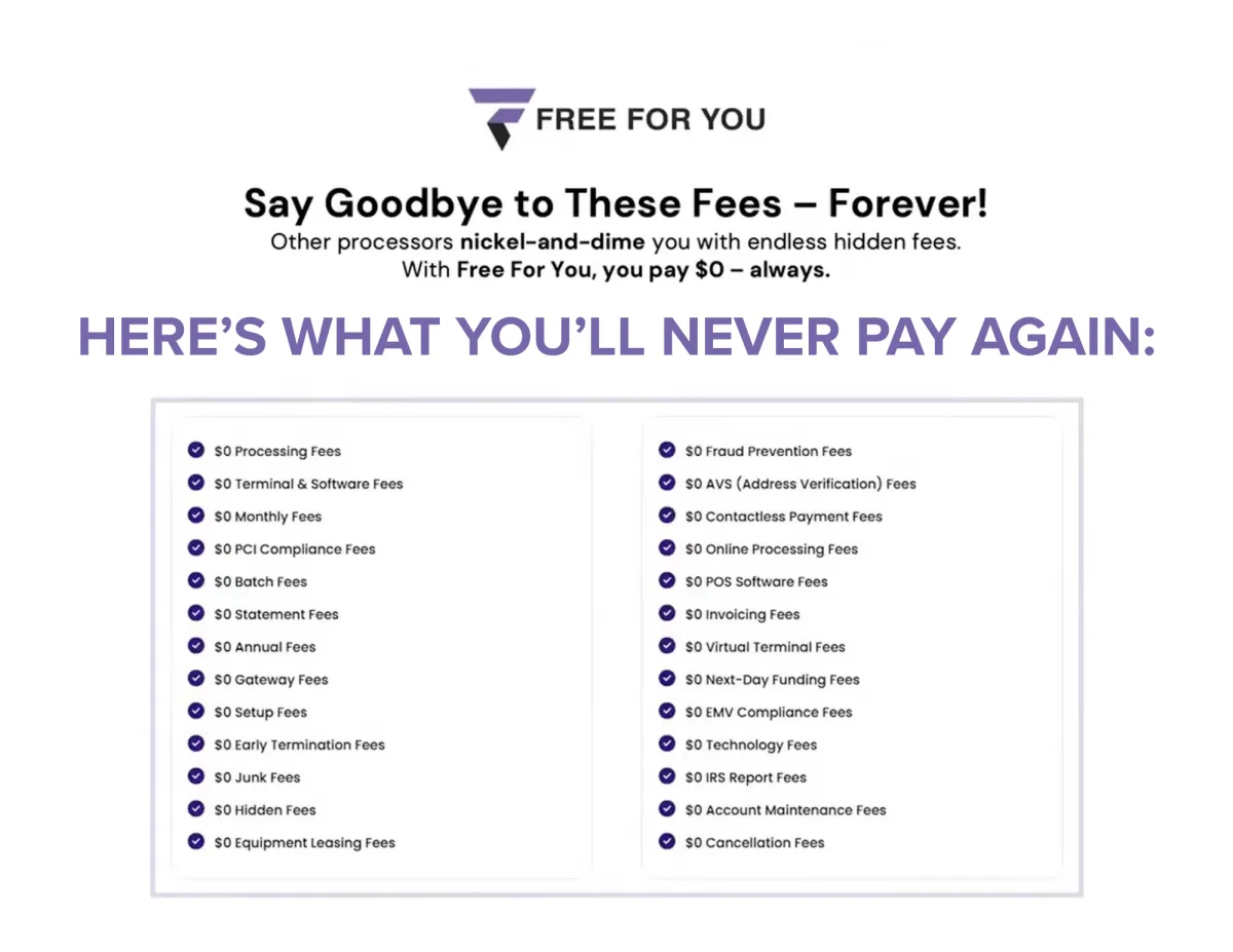 FreeForYou.com eliminates all credit card processing fees for businesses using a Dual Pricing model. Instead of the merchant paying the fee, a small service charge is passed to the cardholder at checkout.